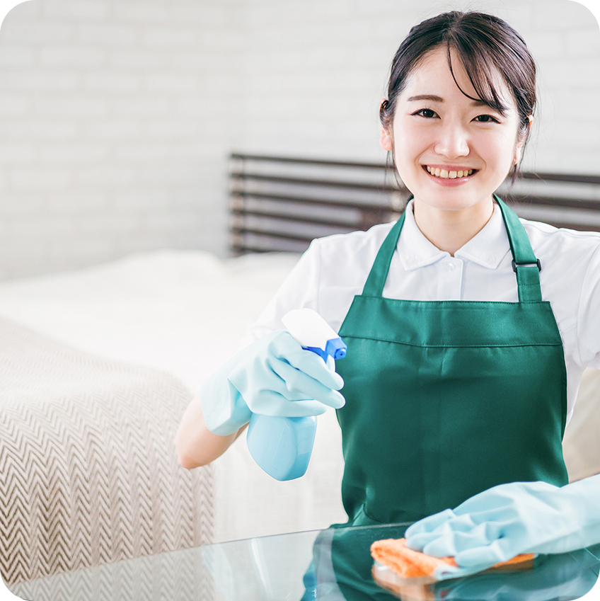 整理整頓、洗面所、キッチン、お手洗い、リビングまでお部屋全体を綺麗にします。ご希望なら、収納コーディネーターが在籍をしていますので、一緒に整理整頓を学んだり、断捨離のお手伝いをして快適な日常を送っていただくことができます。